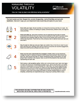 Define and communicate to your team what types of client calls should be immediately escalated to you, which ones the team can handle, and which conversations can be postponed for a later date. Be prepared for a likely increase in calls as the reality and impact of market volatility begins to sink in. Empathy, authenticity and responsiveness go a long way toward putting clients at ease.