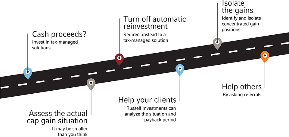 If your clients hold tax-inefficient investments, consider switching to a tax-efficient investing approach when it fits your client's situation. At the very least, stop reinvesting the distributions back into those same tax-inefficient investments.