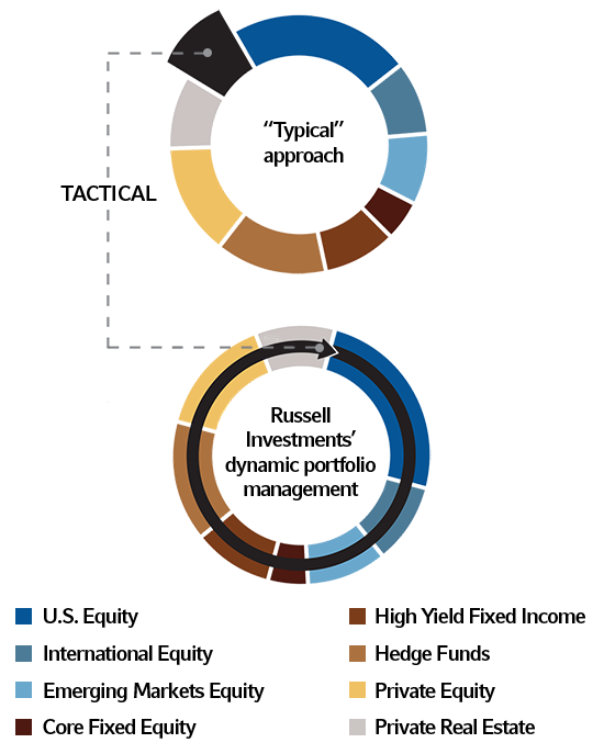In Russell Investments' multi-asset approach shown, the decision about what tactical shifts to make is informed by the underlying holdings of the managers and strategies, plus the risk budget of the total portfolio and the shifts in the market. This approach gives our portfolio managers greater flexibility to adapt the portfolio to short-term market shifts to help retain long-term return potential.